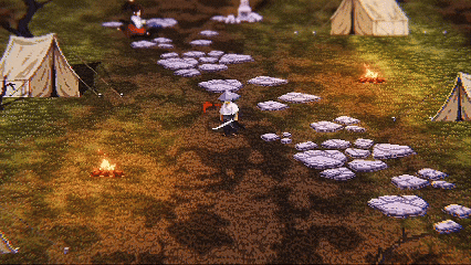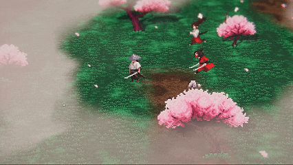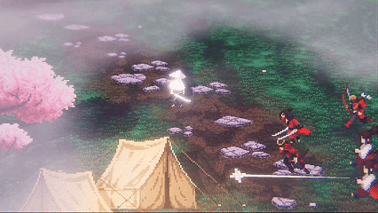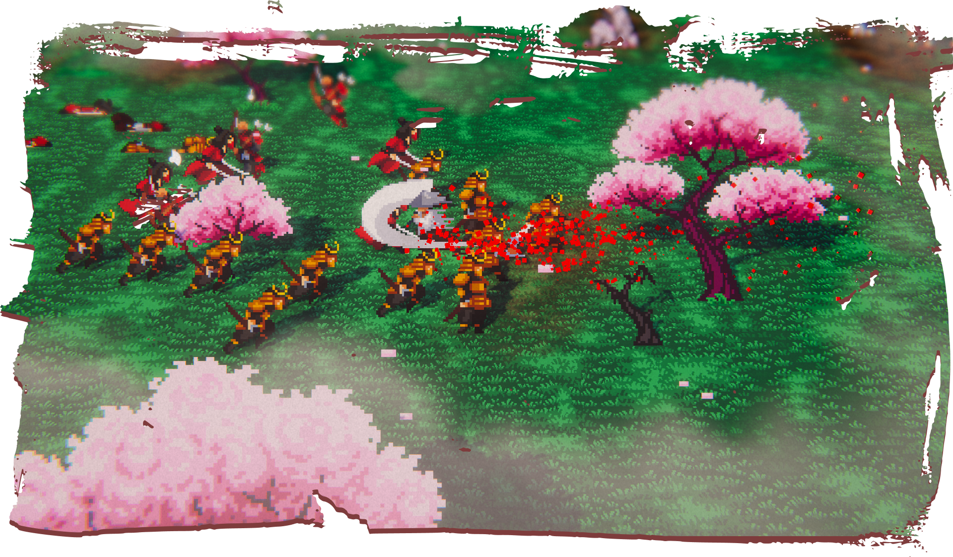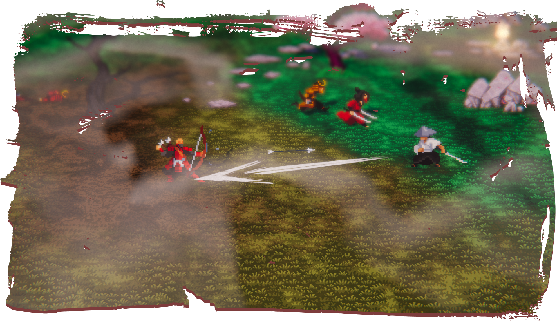 The visual style combines 3D environments with 2D pixel-art character sprites, creating a stylized battlefield where traditional aesthetics meet modern presentation.